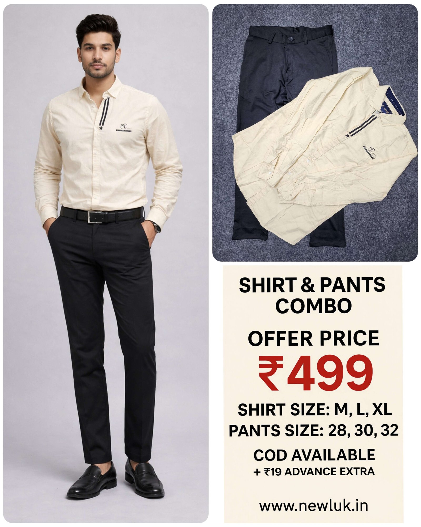 Discover sophisticated elegance with our Cream Plain Shirt & Black Formal Pant Combo Set. This refined ensemble features a premium cream plain full shirt paired with classic black formal trousers, creating a look of understated luxury and timeless style. Perfect for weddings, upscale events, sophisticated offices, and occasions where subtlety makes the strongest statement. Exceptional quality fabric with perfect refined fit. Complete elegant set for just ₹499 with free shipping across India.