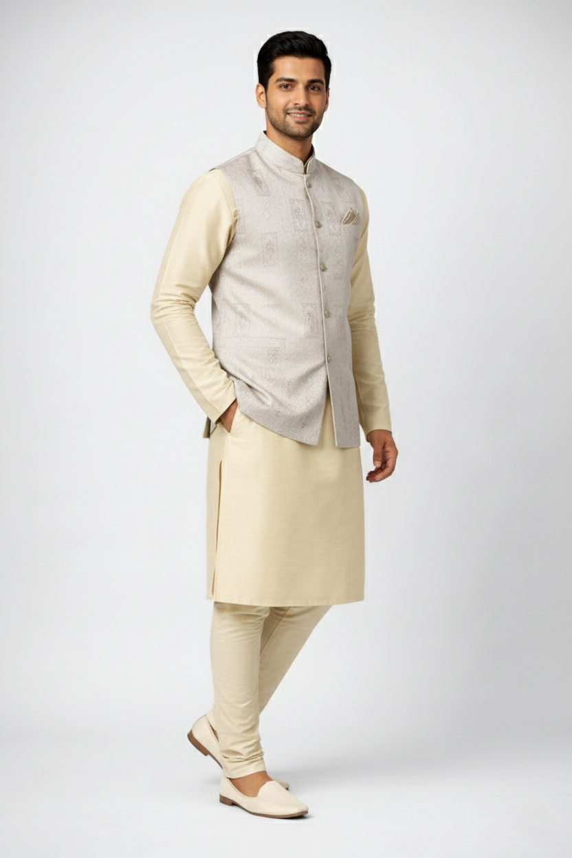 Step into your wedding day with regal splendor in our magnificent Golden 3-Piece Kurta Pajama & Jacket Set. Designed specifically for the Indian groom and distinguished wedding guests, this luxurious ensemble combines traditional opulence with contemporary comfort. Priced at just ₹1699, this premium set features intricate detailing, superior craftsmanship, and majestic golden elegance perfect for the main ceremony, reception, and all wedding festivities.