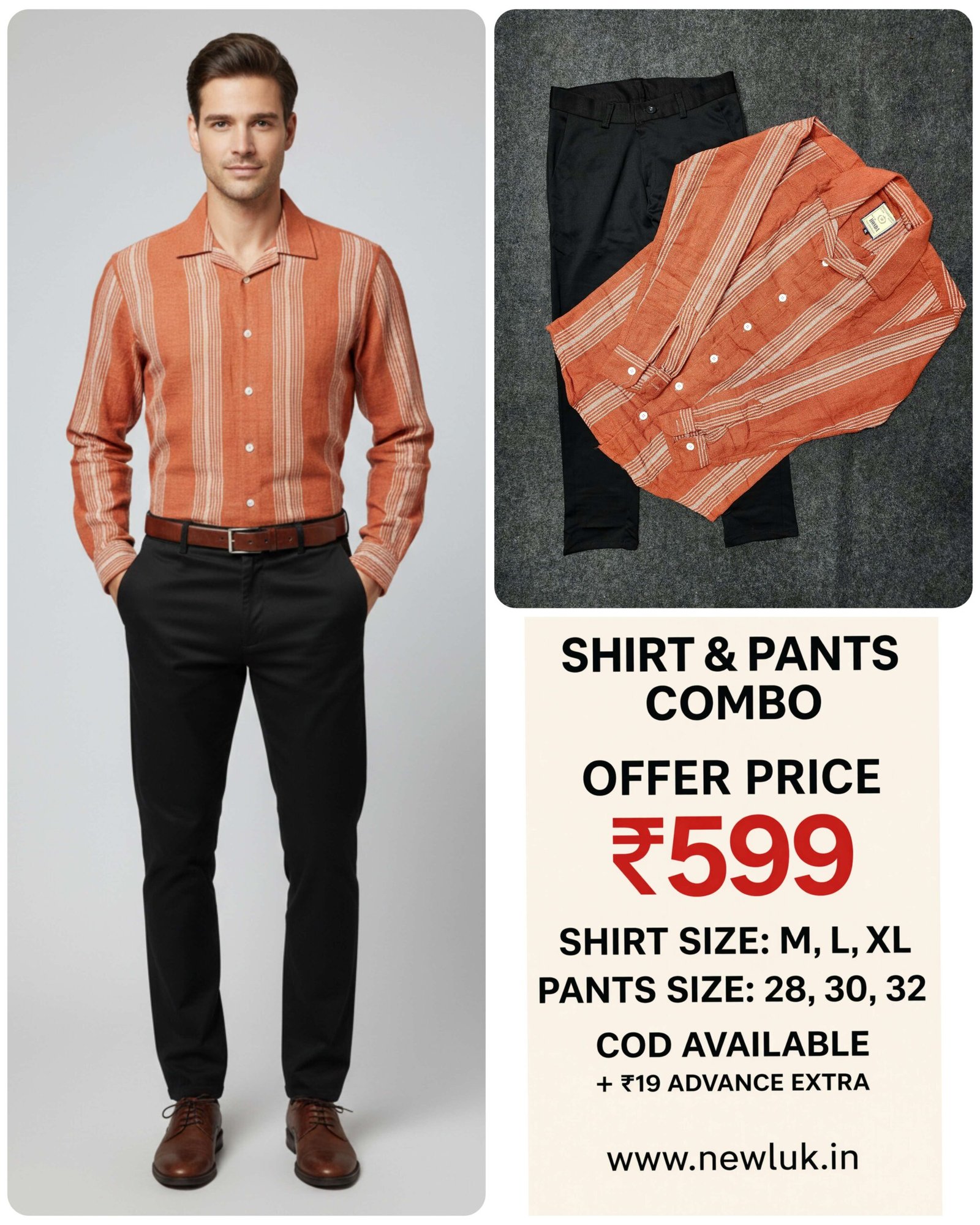 In the spectrum of men’s fashion, where conformity often overshadows creativity, the orange stripe shirt represents a courageous yet calculated style statement—a deliberate choice to embrace vibrancy while maintaining sophistication. Our Orange Stripe Shirt & Black Pant Combo Set embodies this philosophy of confident dressing, offering Indian men a way to participate in festive celebrations and creative professional environments without sacrificing elegance or authority. This ensemble delivers bold distinction at the remarkably accessible price of just ₹599, proving that making a statement need not mean compromising on quality or professionalism.