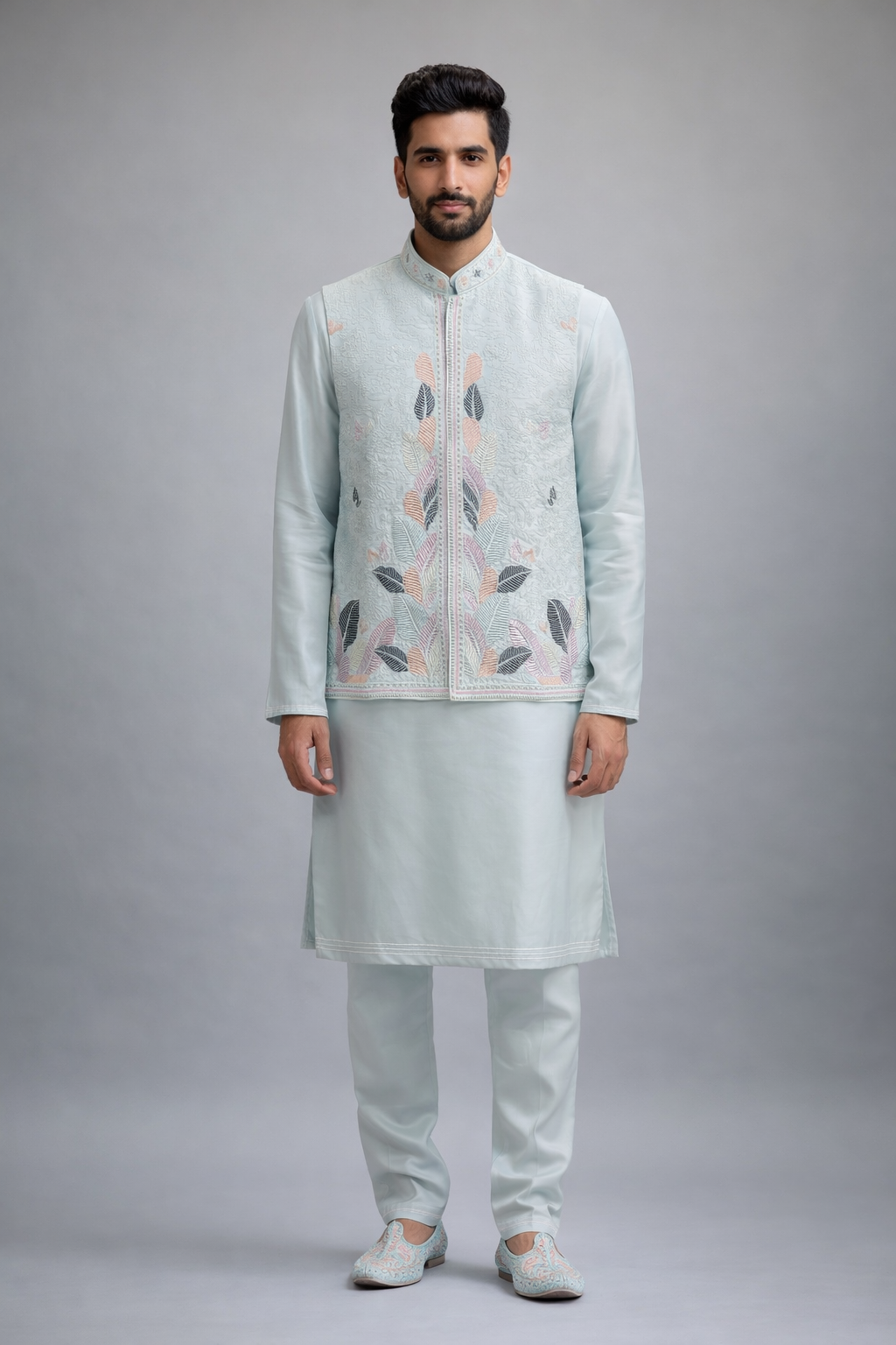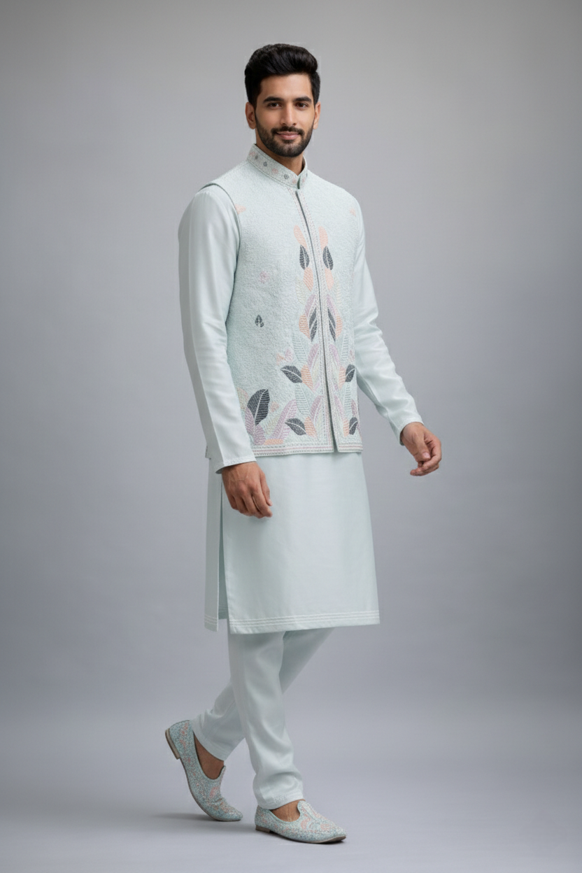 This comprehensive wedding set orchestrates three elements into visual harmony. The sky blue kurta features thoughtful design elements including a mandarin collar with subtle silver-inspired detailing, side slits for enhanced mobility during rituals, and precision stitching that follows traditional Indian garment construction principles while accommodating contemporary fits. The matching pajama employs intelligent tailoring with elastic and drawstring waist options, accommodating both comfort preferences and last-minute adjustments during busy wedding days. The complementary jacket serves as the ensemble’s crescendo, featuring strategic embroidery placement that catches light beautifully during ceremonies and photographs, transforming from daytime elegance to evening sophistication.
