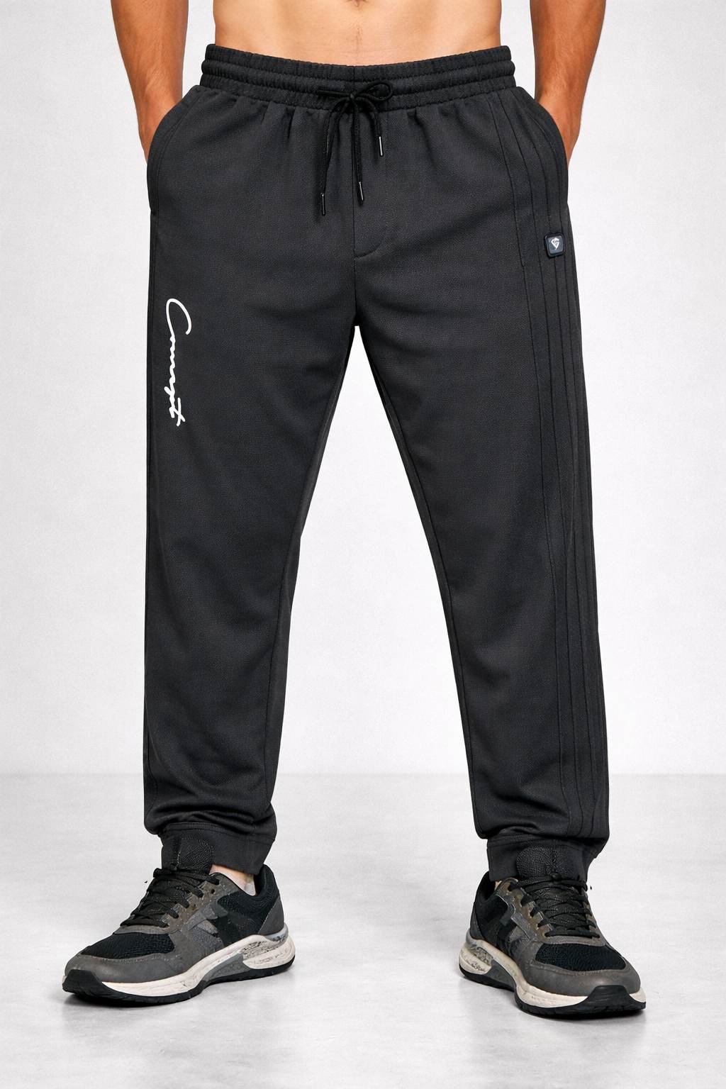 Dark grey track pants offer unmatched versatility and sophisticated appeal: