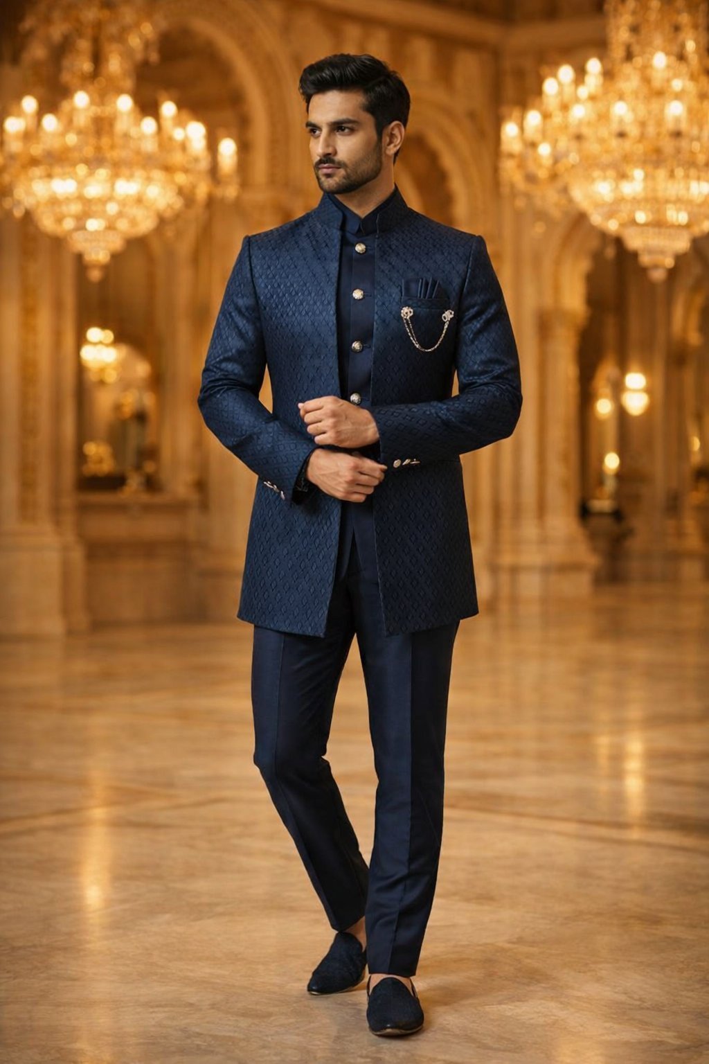 The Regal Jodhpuri Sherwani: Designed with authentic knee-length silhouette that has graced royal weddings for generations. The traditional mandarin collar stands with ceremonial pride, framing the face with regal dignity. The front and sleeves feature extensive gold zari embroidery in traditional royal motifs—carefully placed to create majestic impact without overwhelming. The construction includes royal lining for comfort and structure, with attention to traditional tailoring techniques that ensure the garment maintains its regal drape during ceremonies and photographs.