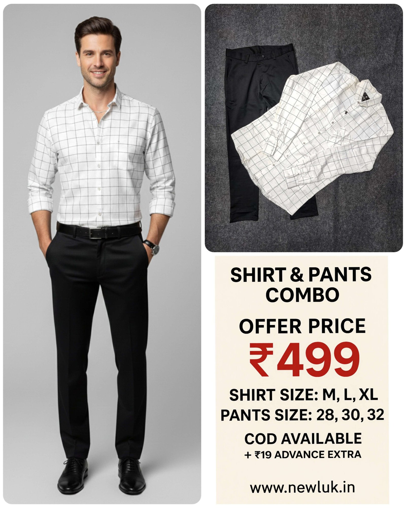 Experience timeless elegance with our White Checks Shirt & Black Formal Pant Combo Set. This classic ensemble features premium white check patterns on full shirts, paired with classic black formal trousers for perfect contrast. Perfect for weddings, sophisticated parties, garden events, and occasions where traditional patterns meet contemporary style. Exceptional quality checks on premium fabric. Complete classic set for just ₹499 with free shipping across India.