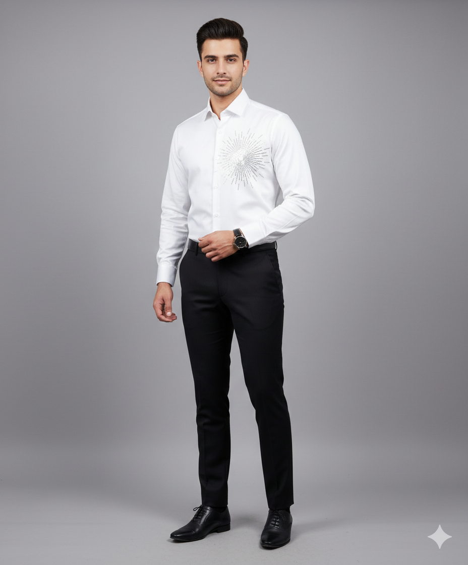 The Wedding Essential: This is the quintessential shirt for the groom and the groomsmen. Pair it with a vibrant sherwani, a sleek Jodhpuri suit, or a classic tuxedo. Its brilliant white base and luxurious sheen provide the perfect foundation for any heavy or minimalist ethnic wear, making the entire ensemble look more expensive and well-put-together.